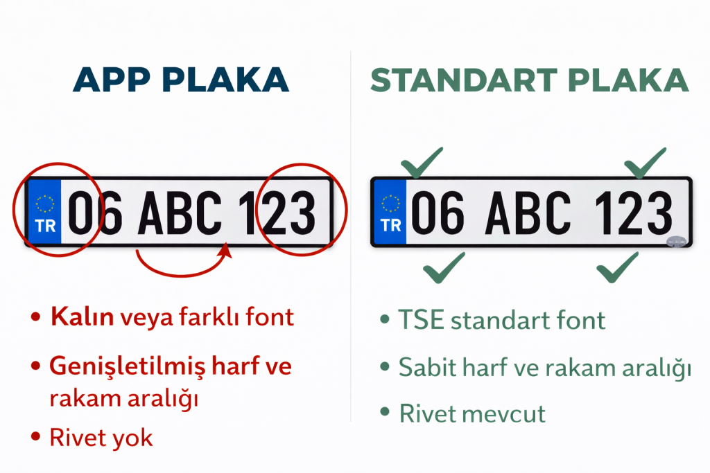 APP plaka olarak bilinen plakalar ise genellikle estetik görünüm amacıyla tercih ediliyor. Bu plakaların harf ve rakamları çoğu zaman standart plakaya göre daha kalın veya farklı yazı tiplerinde hazırlanabiliyor. Bazı plakaların vida yerlerinin kapatıldığı ya da harf aralıklarının değiştirildiği de görülebiliyor.