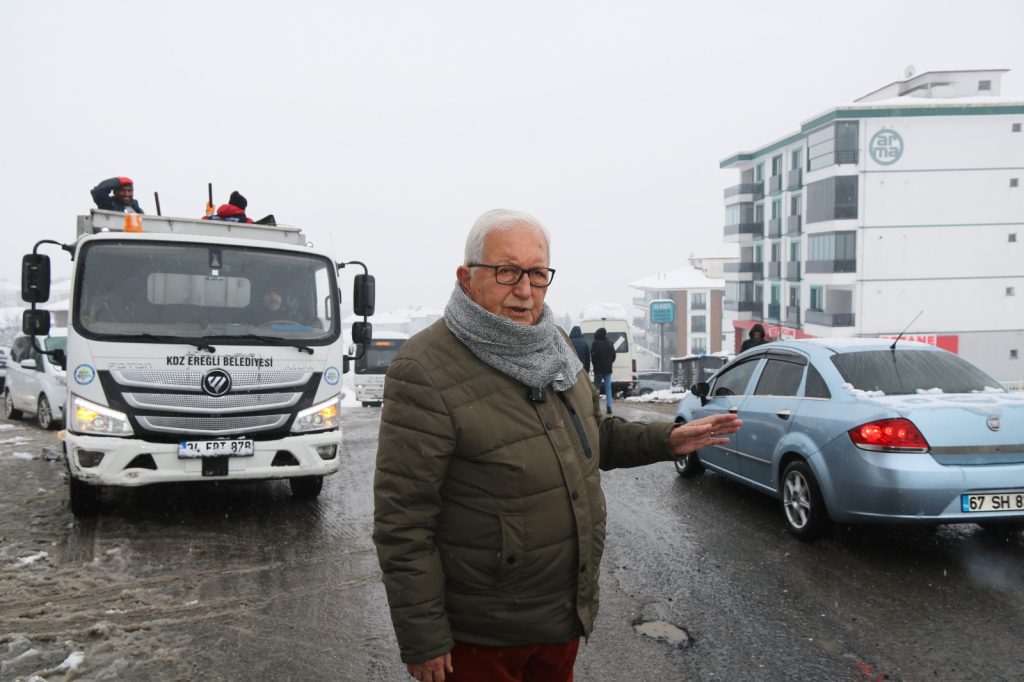 Hastane kavşağındayız şuanda. En önemli merkezlerimizden biri. Belediye olarak çok büyük ağırlık veriyoruz buraya. 24 saat burada hem iş makinemiz var hem tuzlama araçlarımız var. Sağlık bakımından hastalarını getirecek olanlar bir sıkıntıya girmesin diye 24 saat vardiya yapıyoruz. Bu bölgenin kapalı kalmaması için her türlü gayreti gösteriyoruz. Kar yağışı daha çok Ereğli’nin tepe noktalarında yoğunlaşmaya başladı. Sarıkokmaz tepesindeyiz. Bütün ekiplerimiz çalışıyor, hem greyderlerimiz hem tuzlama ekibimiz çalışıyor. Tıkalı bir yolumuz yok.”
