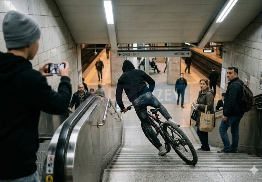 Bir metro istasyonunun merdivenlerinden bisikletiyle inmeye çalışan genç, dengesini kaybederek sert bir şekilde yere düştü. O tehlikeli anlar, gencin yanında…